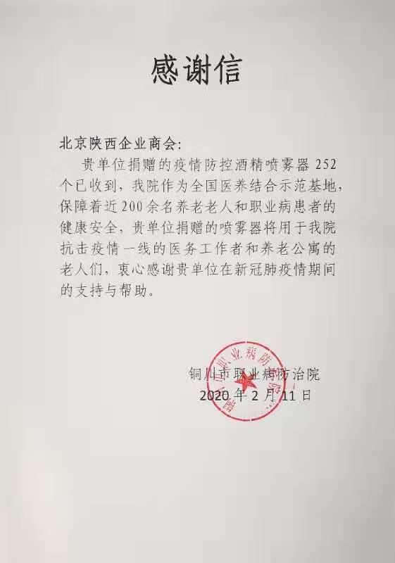 2020年1月新冠肺炎疫情爆发初期,商会第一时间发布倡议书,号召全体会员同仁与在京陕西乡党进行捐赠,大力承担企业社会责任,众志成城驰援疫区。江榕会长个人带头捐款50万元,商会合计募捐828600元,为陕西家乡购买了9万个医用口罩、50桶过氧乙酸(200KG/桶),以及紧急从以色列采购了1,2000件医用防护服。会员企业、会员个人还通过公益基金、红十字会等其他渠道合计募捐39,741,500元抗疫物资,为商洛、西安、榆林、渭南、安康、宝鸡、汉中、铜川、北京、内蒙古、深圳各地的抗疫一线单位捐赠了医用口罩、医用手套、抗病毒药、消毒液、水果蔬菜、有机盒饭、肉类鸡蛋、净水设备等一系列抗疫物资,为战斗在一线的工作者们送去了爱心防护与温暖,为疫情抗击奉献了广大力量。