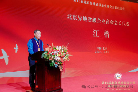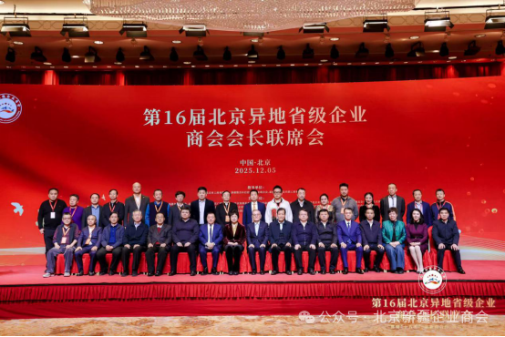 为深入贯彻党的二十届四中全会精神,奋力开启“十五五”规划谋篇布局,由北京工商业联合会、新疆维吾尔自治区工商业联合会、新疆生产建设兵团工商业联合会为指导单位,北京异地省级商会主办,北京新疆企业商会承办的第十六届北京异地省级企业商会会长联席会于2025年12月5日在新疆维吾尔自治区人民政府驻北京办事处北京新疆大厦召开。北京陕西企业商会会长江榕、秘书长孙雨霏受邀出席。