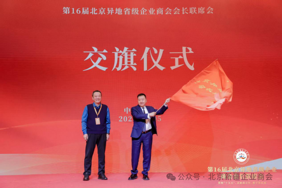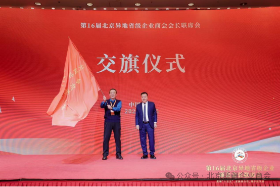 会议最后,举行了简洁而庄重的交旗仪式。北京新疆企业商会会长丁国进将北京异地省级企业商会会长联席会的会旗郑重交至17届北京异地省级企业商会会长联席会举办方北京陕西企业商会会长江榕手中,旗帜的交接象征着责任的传承与使命的延续、砥砺前行、再创辉煌。