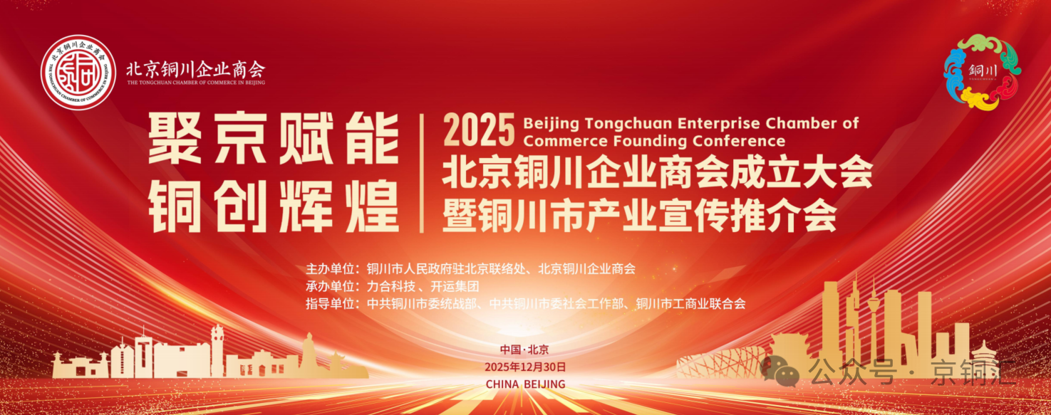 2025年12月30日,在铜川市委市政府的领导下,铜川市人民政府驻北京联络处指导下,主题为“聚京赋能,铜创辉煌”的北京铜川企业商会成立暨铜川市产业宣传推介会(以下简称“大会”)在北京中和大饭店顺利召开。本次大会由陕西省铜川市人民政府驻北京联络处、北京铜川企业商会主办(以下简称“商会”),中共铜川市委社会工作部、铜川市工商业联合会指导,众多政企领导、商界精英齐聚一堂,共襄盛举,见证北京铜川企业商会成立的重要时刻,共话京铜两地合作发展新蓝图。
