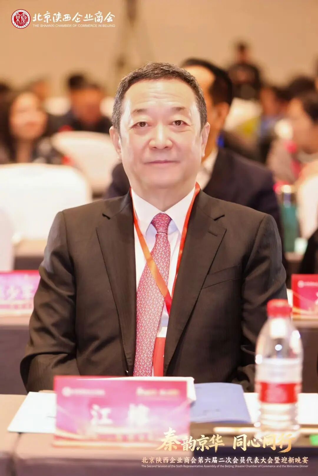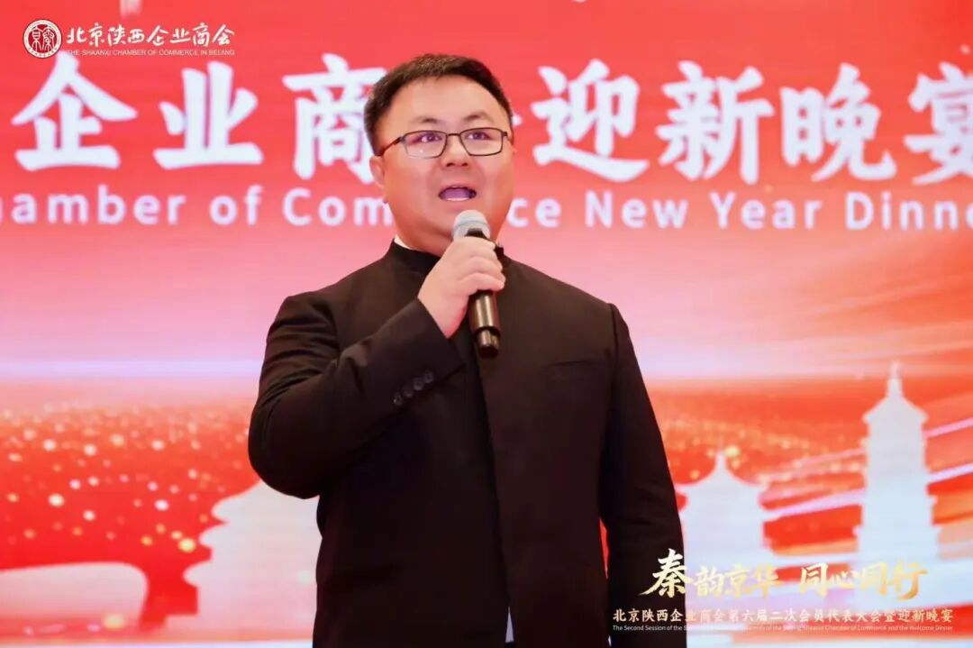 在大会的欢庆时刻,北京陕西企业商会会长江榕发表热情洋溢的祝酒词。他首先代表商会向莅临晚宴的各界嘉宾、会员代表及兄弟商会同仁致以诚挚感谢,强调商会过去一年的蓬勃发展离不开社会各界的鼎力支持与全体成员的共同努力。最后,举杯祝愿大家在新的一年里事业蒸蒸日上,并希望来宾们尽情享受今晚的盛宴,共同见证商会更加辉煌的明天。
