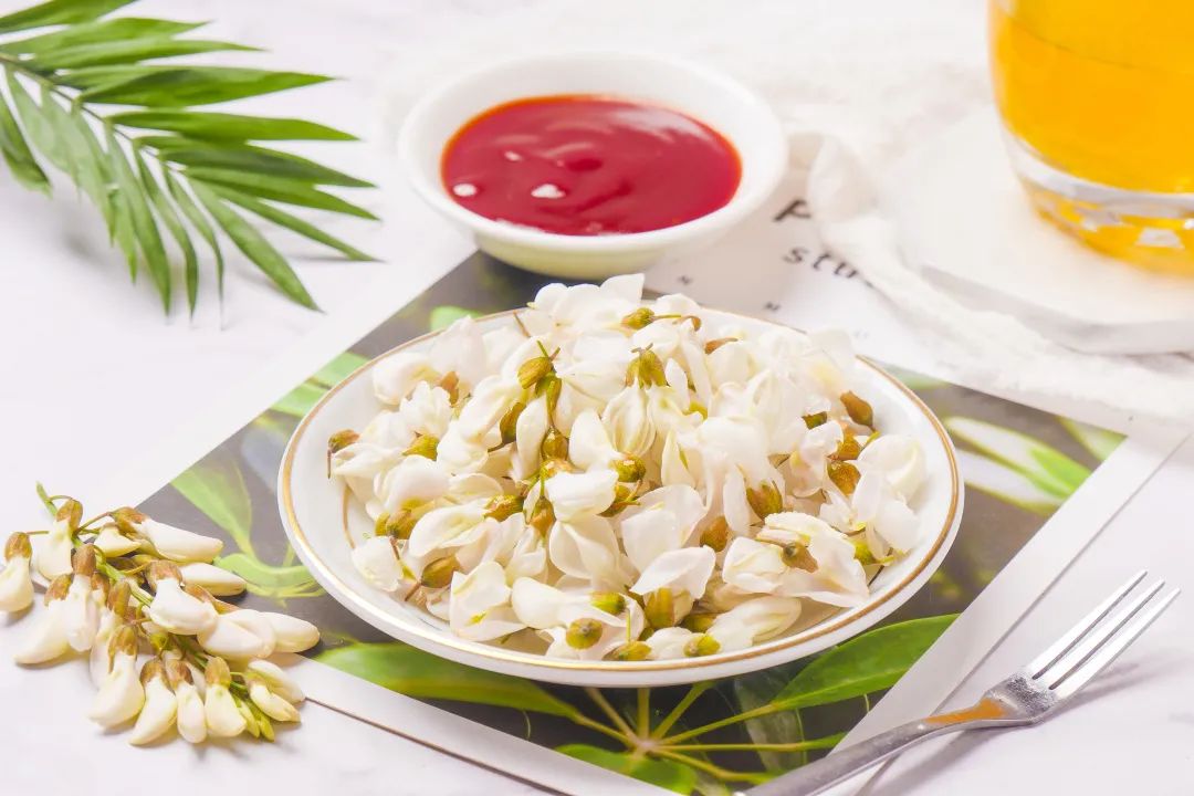 把槐花用开水烫烫,捏去水分,再拌入面粉和盐放到蒸屉里蒸。做好后,每人盛一碗,浇些调好的蒜汁儿。每吃一口,都是满嘴的清香,那味道真是鲜美极了。