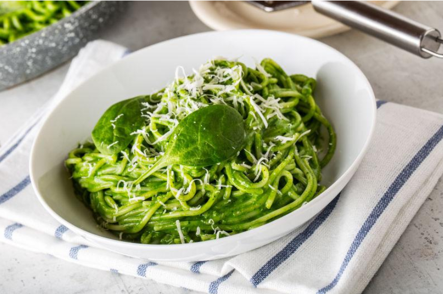 面的绿色源自于榨取而来的菠菜菜汁:将富含营养的绿汁和面粉一起搅拌均匀,和好面团再或擀或扯或压,做成汤面、干面、凉面、炒面都可以。