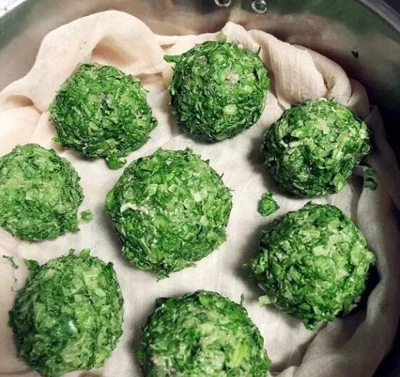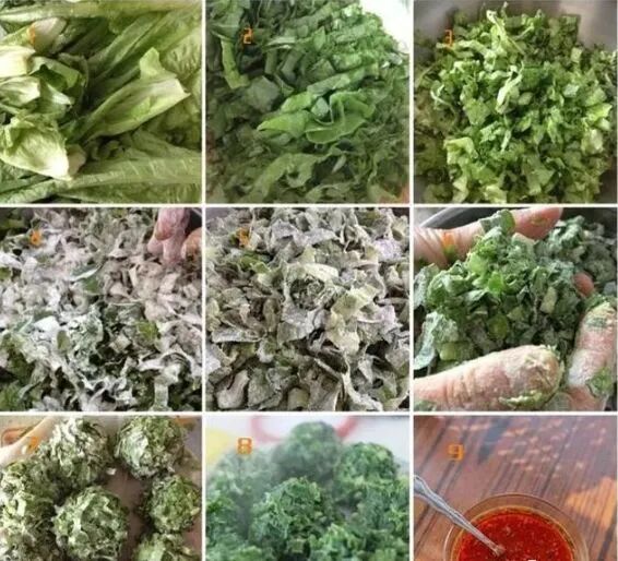 将青菜叶子切碎后,再和上面粉和碱面、盐巴等调理均匀,之后上锅蒸成软乎乎的饼状。接下来放凉切段或揉捏成形后,便成了一口即能吞下的可爱“疙瘩”。